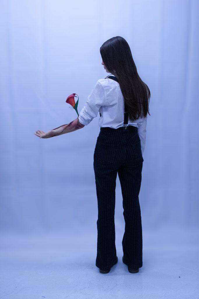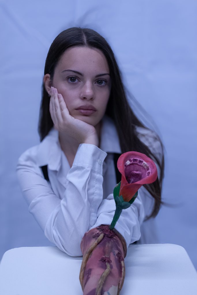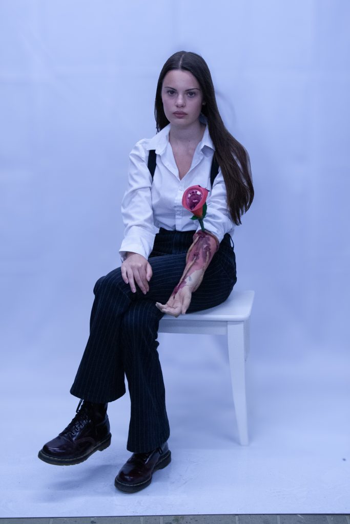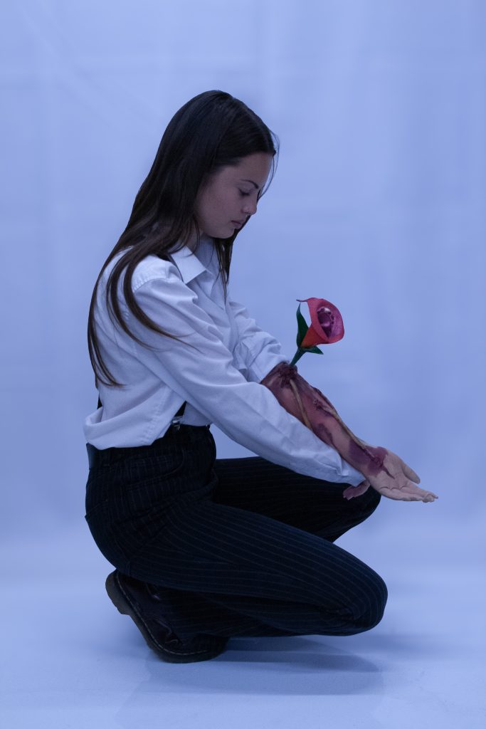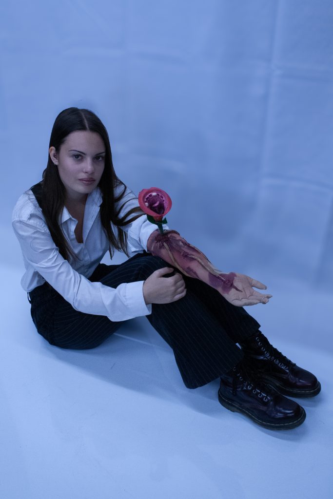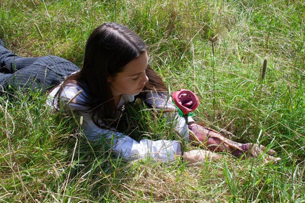 The Moaning Lily is the story of a botanist who is so consumed by his work that he grafts a rare flower onto his own arm despite knowing that it will cause his death. It is a story of obsession and a gothic-horror. I chose to make this a body-horror puppet, trying to make the flesh and skin on there glove look as real as possible. A wire runs from the middle finger to the tongue so that when the hand moves the tongue does too. This puppet was photographed in a studio photoshoot and an on-location photoshoot. I also made a short film using an extract from the short story. I also used an AI image generator and photoshop to edit one of the studio photographs to look as though the model is showing the puppet to the world press at a flower show, like in the story. I curated the rest of the outfit but did not make it.